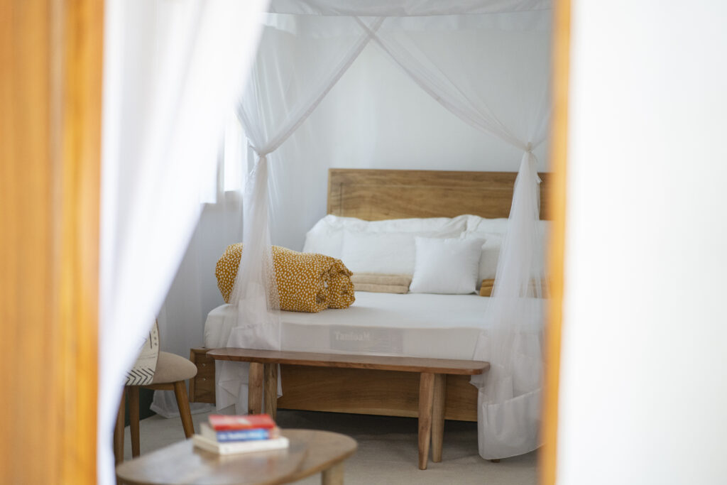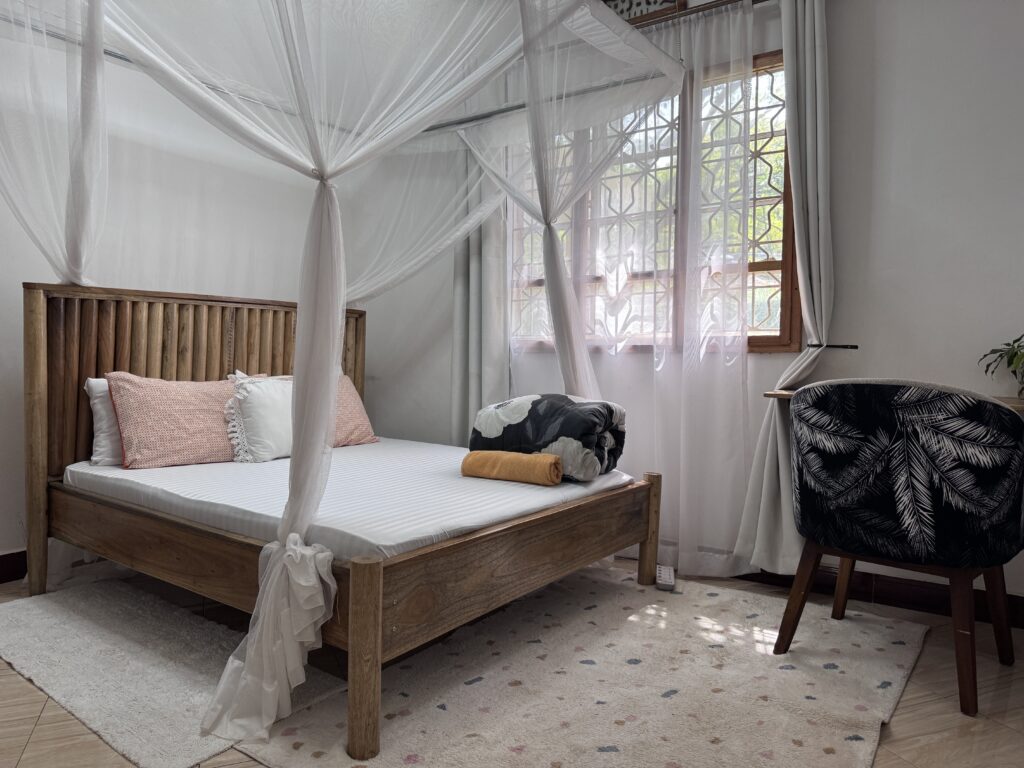 A quiet, garden-facing room designed for rest and focus, perfect after a day exploring Moshi